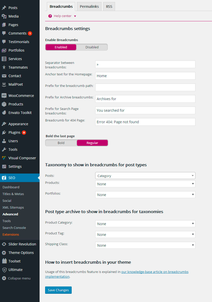 You can configure Breadcrumbs and Permalins at SEO -> Advanced page.