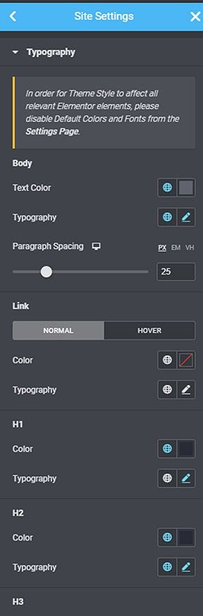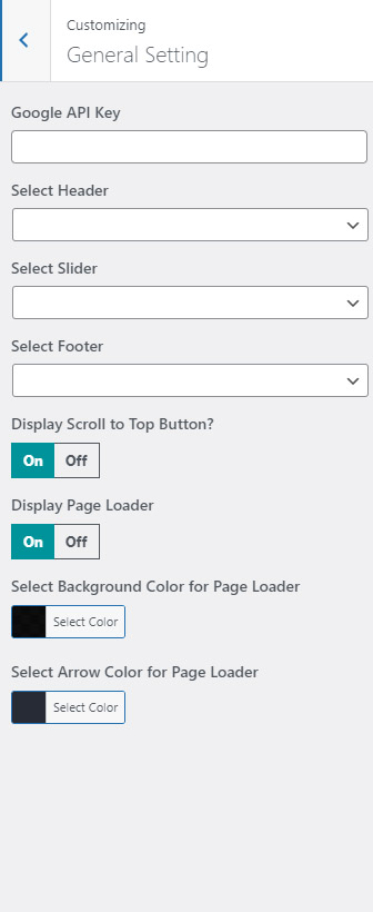 You can set your Google Map API key, choose your home page and configure page loader.