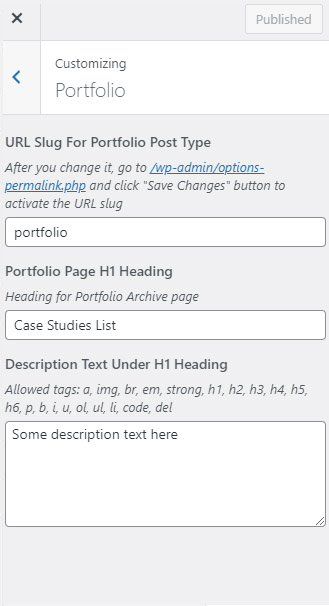 On the Portfolio tab, you can set slug and heading with description for portfolio archive page.